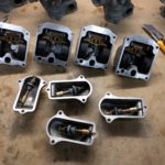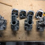 After making sure all the new gaskets match up to the carbs, carefully started scraping the old gaskets off. Curious if they were sealed to the tops previously (at factory?) or that just happens after 40 years. Why would it only stick the top and not the bottom if not some sort of adhesive? I opted not to seal these new ones, though…seems good enough with screw tension? Plus I’ll be taking these on and off, often, plus like, don’t want ANYTHING inside the carbs except gas and air. After the fifth scraping ordeal I started getting more aggressive / faster with the blade, sometimes shaving off a bit of aluminum—not much, but best to be more careful. Wire brushed the surfaces, too.